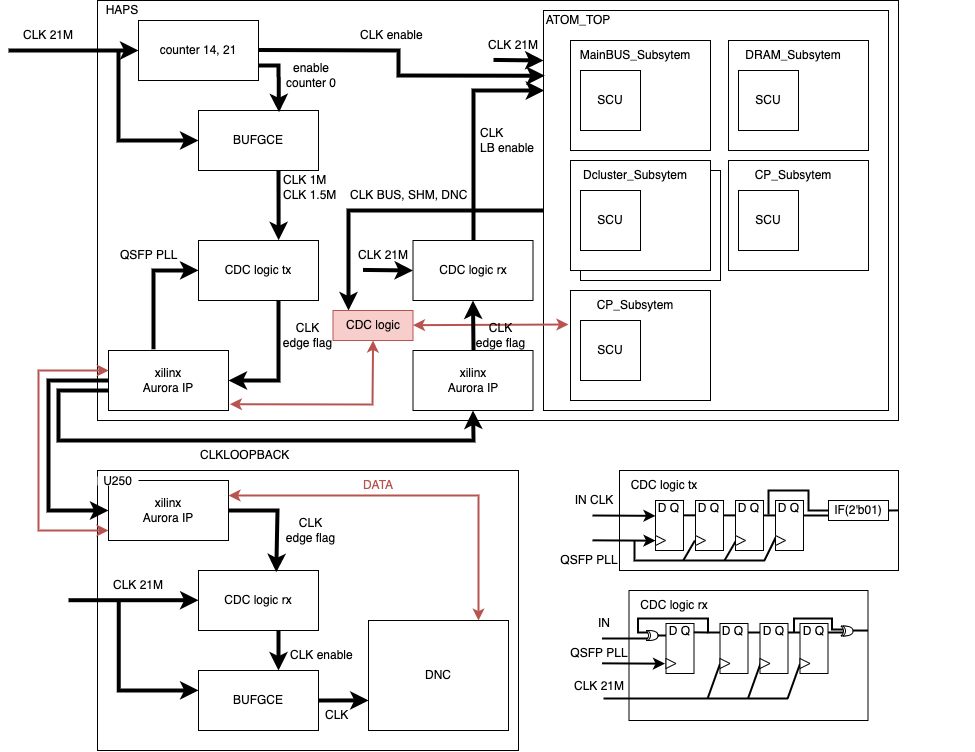 A cornerstone of accurate emulation is maintaining synchronous operation across all FPGAs. This requires a precisely engineered clock and reset distribution system. Unlike ASIC methodologies that rely on automated flows (SDC, PIPD), multi-FPGA designs demand explicit and optimized inter-FPGA signal propagation. Our solution employed Xilinx Aurora IP as the high-speed physical layer, upon which we built a custom protocol for distributing synchronized clock and reset signals across the entire system.