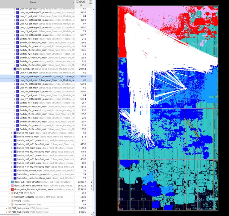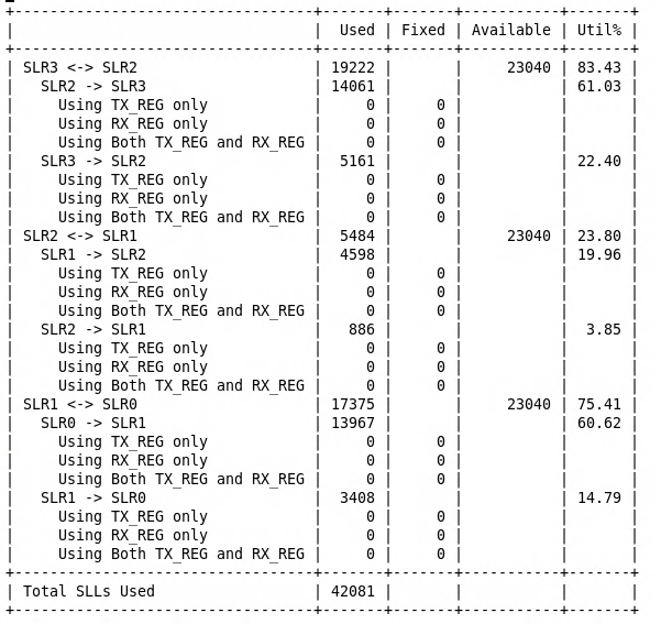 - Persistent Routing Congestion: The 128-bit AXI Bottleneck: Even with optimized HSTDM placement, the 128-bit width of the main NOC AXI bus presented a persistent routing challenge. The sheer volume of signals, particularly within the VU19P’s limited SLL (Slice Logic LUT) interconnect and across the relatively constrained SSI (Stacked Silicon Interconnect) links between SLRs, threatened implementation feasibility. The Main Bus alone accounted for approximately 13,000 nets (