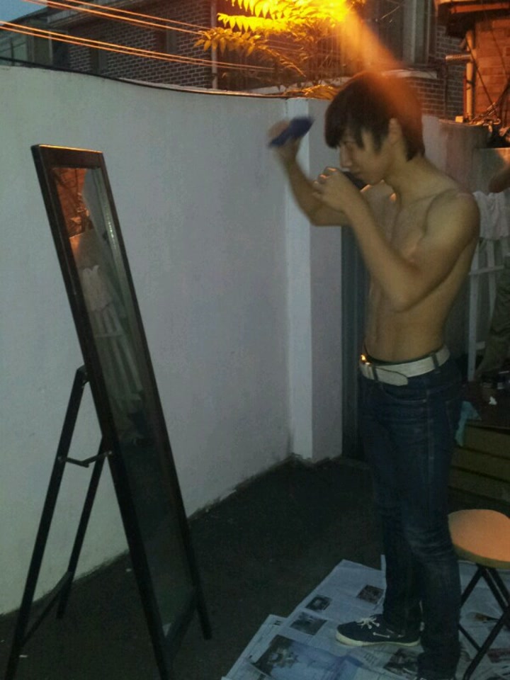 군대 가기 일주일 전 스튜디오 뒤뜰에서 머리 자르는 모습