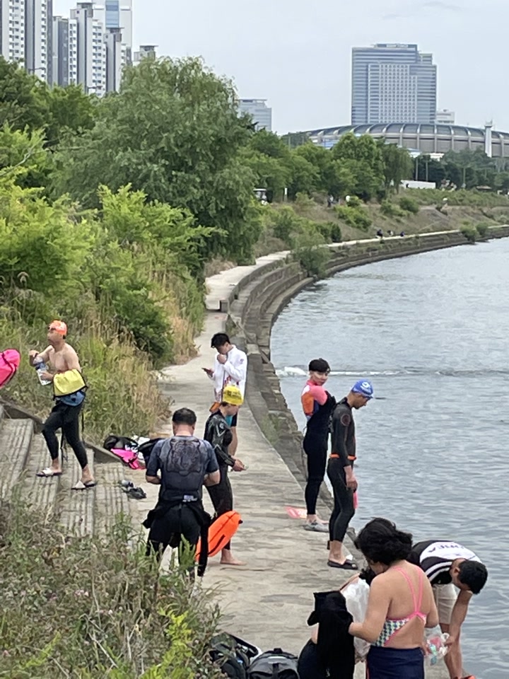 한강변에 도착하니 수영복을 입은 분이 보였다. 뻔뻔함이 무기였다. 쭈뼛거리며 다가가 부탁드렸다. “저 야외 수영이 처음인데… 혹시 같이 건너주실 수 있나요?”