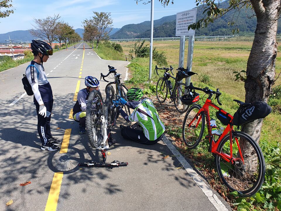 가는 길에 자전거 체인이 끊어져 곤란해하는 아버지와 아들을 만났다. 초등학생 아들이 자전거를 좋아해서 부산까지 도전 중이라는데, 아버지는 정비 방법을 몰라 20km 떨어진 읍내까지 걸어가려던 참이었다고 했다. 사대강 길 한복판이라 택시도 안 잡히는 상황.