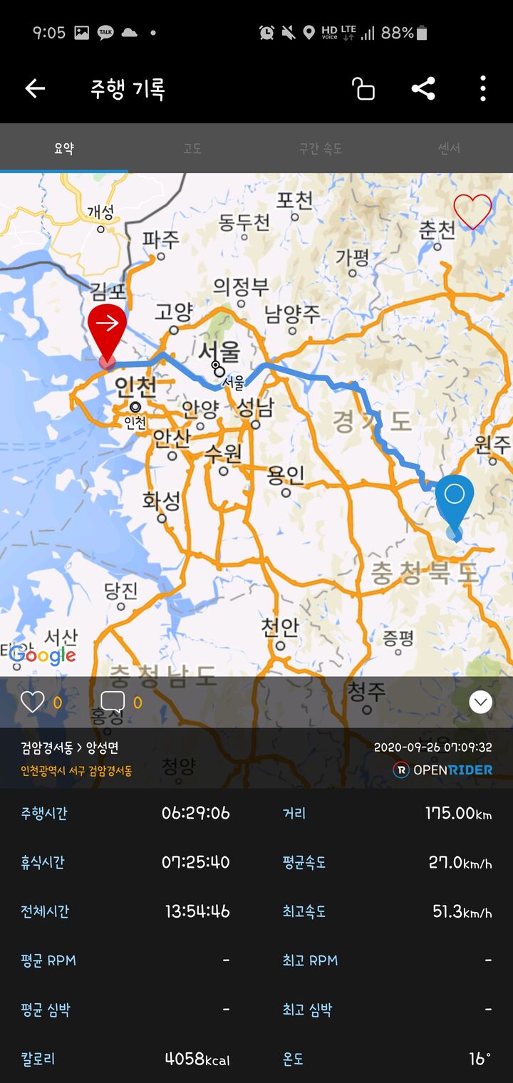 무작정 부산으로 쏠 수는 없어서, 사전 연습 겸 춘천 라이딩을 시도했다. 아침 7시부터 저녁 8시까지, 아버지와 여동생과 함께 야심 차게 출발했다. 하지만 중간에 비가 쏟아져 도로가 유실되었고, 결국 청평을 코앞에 두고 돌아와야 했다. 동생은 힘들다며 중간에 지하철로 탈주(?)했고, 결국 아버지와 나 둘이서 해 질 녘 어두운 길을 뚫고 인천으로 복귀했다.